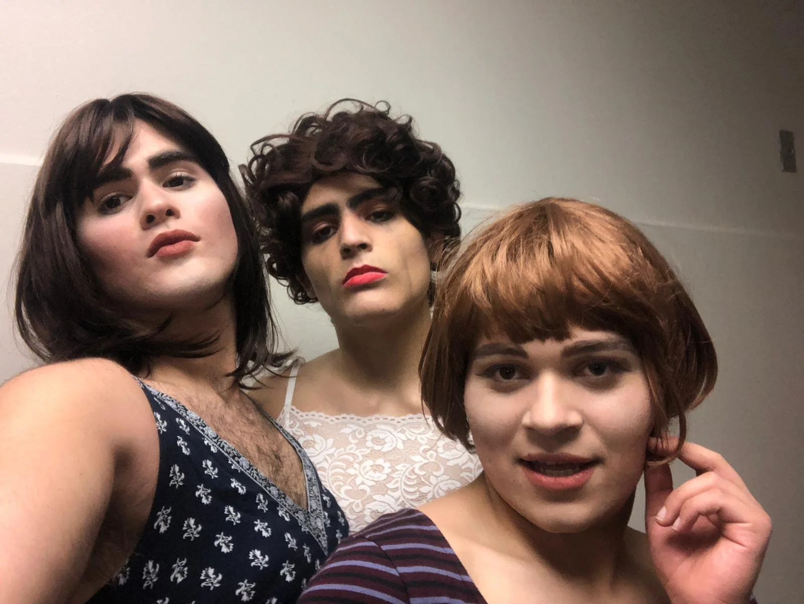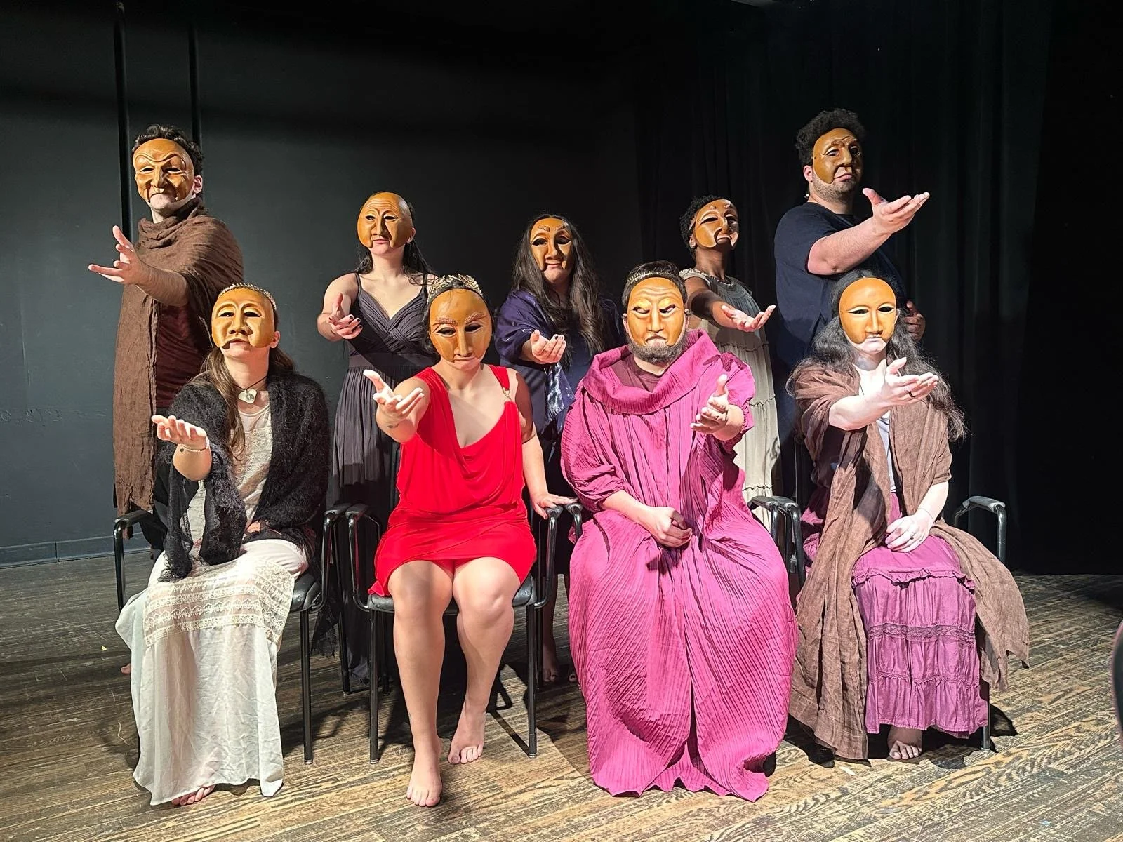 Me as Aegisthus, the paranoid usurper with pink robes, in "The Libation Bearers" by Aeschylus